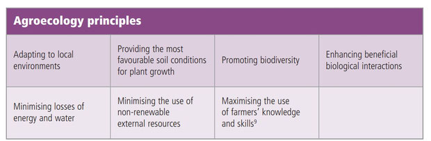 Zu den Methoden, zählen beispielsweise Fruchtfolge, biologische Nährstoffkreisläufe und integriertes Schädlingsmanagement. Ein zentrales Merkmal ist das Vereinen von ökologischen, sozialen und wirtschaftlichen Aspekten. Der Ansatz beschränkt die Umwandlung von Gras und Waldflächen zu agrarwirtschaftlicher Nutzung.