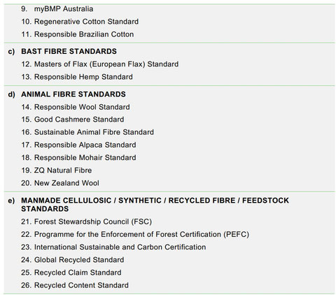 Der Standard berücksichtigt ausschließlich Fasermaterialien und keine Stoffe, sodass beispielsweise GRS-zertifizierte Fasern anerkannt werden, während GRS-zertifizierte Stoffe nicht akzeptiert sind.