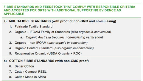 Der GRTS schreibt 90% oder mehr nachhaltige Fasern vor. Erlaubt sind die folgenden Fasermaterialien, die den oben gelisteten Kriterien (GRTS Section 2.1) entsprechen: